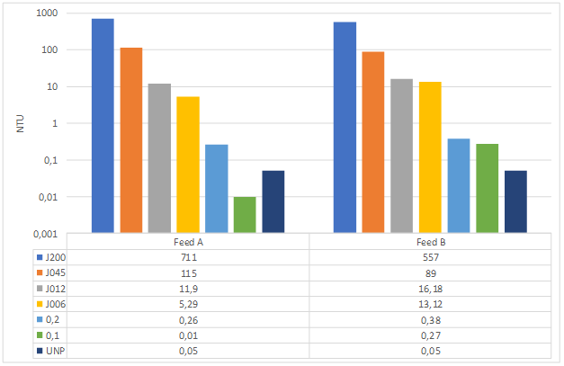 Figure 1: Filtrate quality by NTU (Nephelometric Turbidity Units) from disposable and DMF filters