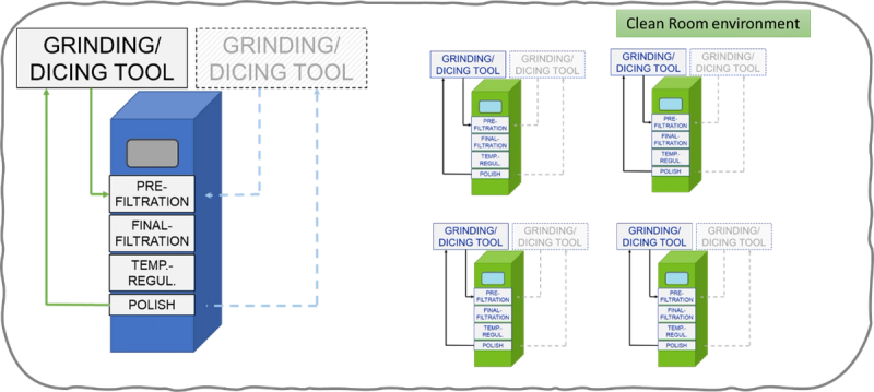 Alternatively, a centralized treatment can be installed in the sub fab. The decision for centralized or decentralized solutions depends on flow rate and concentration of suspended solids. A centralized unit becomes a more attractive option for reclaiming this wastewater when the flow is higher and there is a greater concentration of solids. The water is chemically not contaminated and the reclaimed water is very near to deionized (DI) water quality – as such it is definitely much cleaner than any raw water source.. Naming the reclaim ‘wastewater’ is quite misleading as the water has a high degree of cleanliness, and therefore it is very valuable.