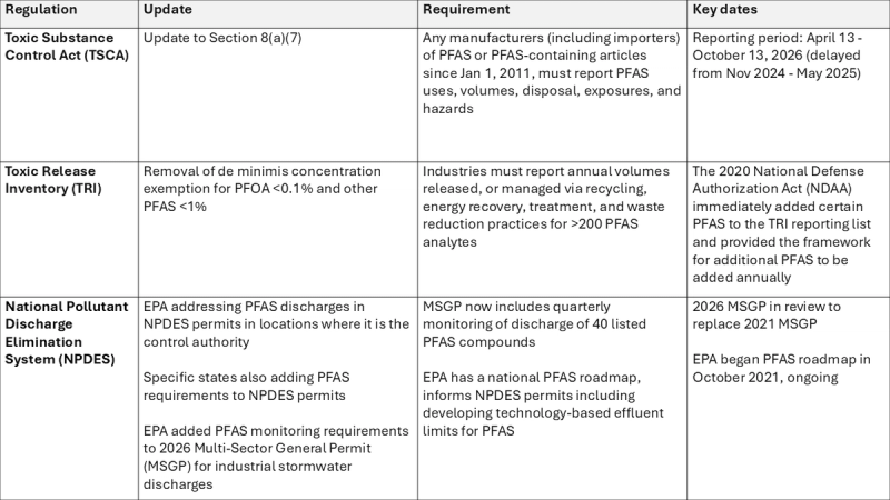 Another big change is the Toxic Release Inventory (TRI) reporting. That's been coming out for several years now, but there are somewhere around 200 different PFAS that are currently required to be reported. The regulators recently removed the de minimis concentrations. Before, this applied to anything over 1% but now it's all PFAS concentrations.