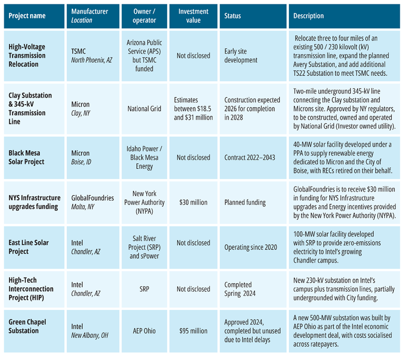 This table shows the scale and structure of energy utility investments backing some of the largest semiconductor projects.