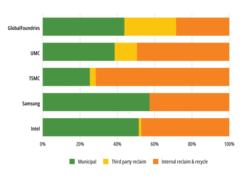 This chart shows the proportion of internally reclaimed water used alongside external sources for the top five semiconductor manufacturers by market share (excluding SMIC due to a lack of published data).
