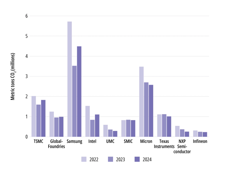NXP Semiconductor saw the largest decrease in emissions from 2022 to 2024, at 52.7%, focusing its reduction strategy on upgrading tools and installing abatement equipment, purchasing renewable electricity, optimizing manufacturing processes, and substituting chemicals with lower global warming potential. Lowering perfluorocarbon (PFC) emissions has been a key focus, through the above measures NXP has lowered associated emissions by 67% since 2015. Importantly, unlike other manufacturers, NXP did not ramp up production during this period since its Dresden and Singapore fabs are still under construction, giving the company flexibility to achieve emission cuts. Maintaining these reductions will be challenging as the new fabs begin production around 2027.