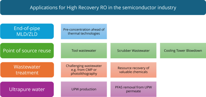 Whilst the applications for high recovery RO are numerous in semiconductor fabs, the biggest shift in demand stems from the surge towards end-of-pipe MLD and ZLD schemes. Here, high recovery RO is used as a pre-concentration step to reduce the size of costly thermal brine concentrators.
