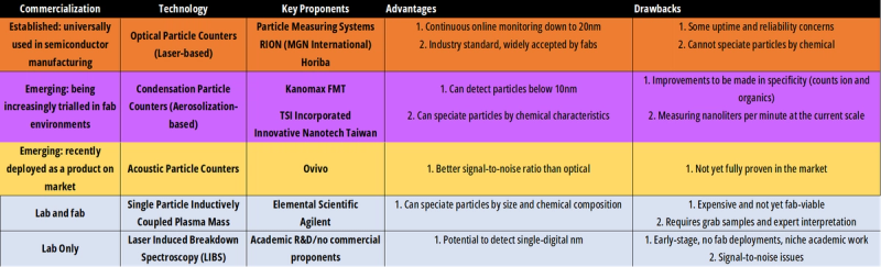 Emerging technologies include aerosolization-based condensation particle counting, which has the proven capability to detect particles below 10nm but picks up non-particulate contamination such as ions and organics. It has made headways into the semiconductor industry but is not utilized on a widespread basis in the same way as OPCs as its use case is more suited to extremely advanced nodes or for profiling excursions.