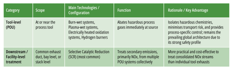 POU units focus on destroying toxic and pyrophoric process gases, while facility-level systems more commonly treat consolidated secondary emissions such as NOx.