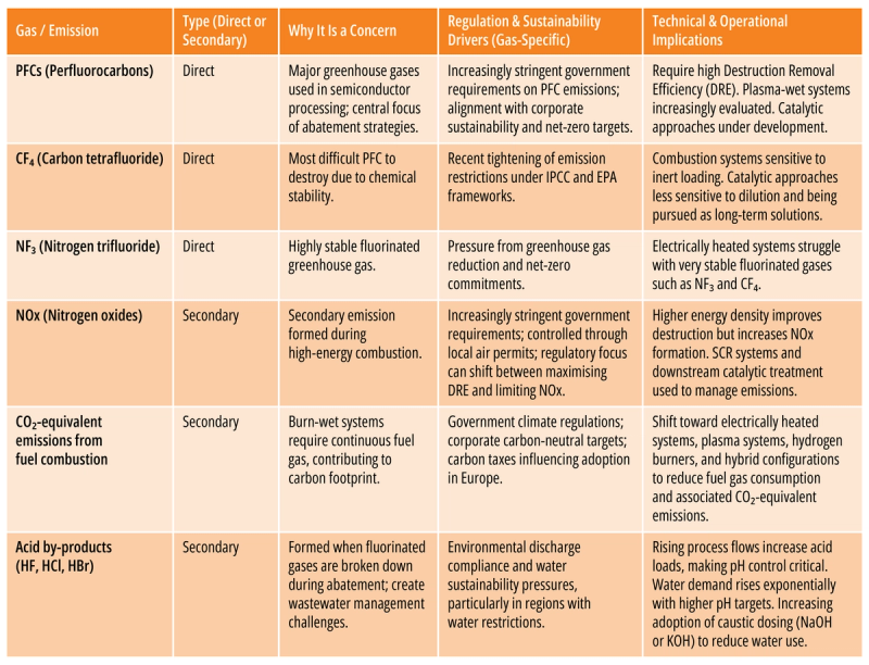 However, trade-offs between sustainability and performance persist, as low-carbon alternatives do not yet consistently match the reliability and destruction efficiency of conventional burn-wet systems. Plasma abatement is gaining traction, particularly in Europe, where carbon taxes are encouraging many greenfield sites to evaluate it as a primary point-of-use (POU) solution, according to McCrory. By replacing fuel gas with electricity, plasma systems simplify onsite gas infrastructure and reduce direct combustion emissions.